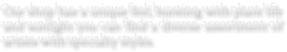 Location Our shop has a unique feel, bursting with plant life and sunlight you can find a diverse assortment of artists with specialty styles.